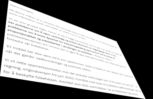 I brevet hevdes det at det ikke finnes noen medisinske motiv for å videreføre krisepolitikken. Denne krisepolitikken framstilles også som svært uproporsjonal, mer skadelig enn nyttig.