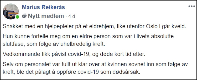 Det har lenge vært kjent at Covid-19 ikke er noen farlig sykdom. De som er i risikogruppa er eldre mennesker som gjerne har annen underliggende sykdom i tillegg. Som alle vet er det nettopp i høy alder at én eller annen infeksjon kommer og setter en stopper for livet vårt. Men visse krefter har greid å gjøre dødsfall som dette til en skandale når koronaviruset er innblandet. Denne skandalefaktoren er det regjeringen har lagt til grunn for å kunne iverksette de smitteverntiltakene og den økonomiske voldtekten av landet. Det er helt surrealistisk!