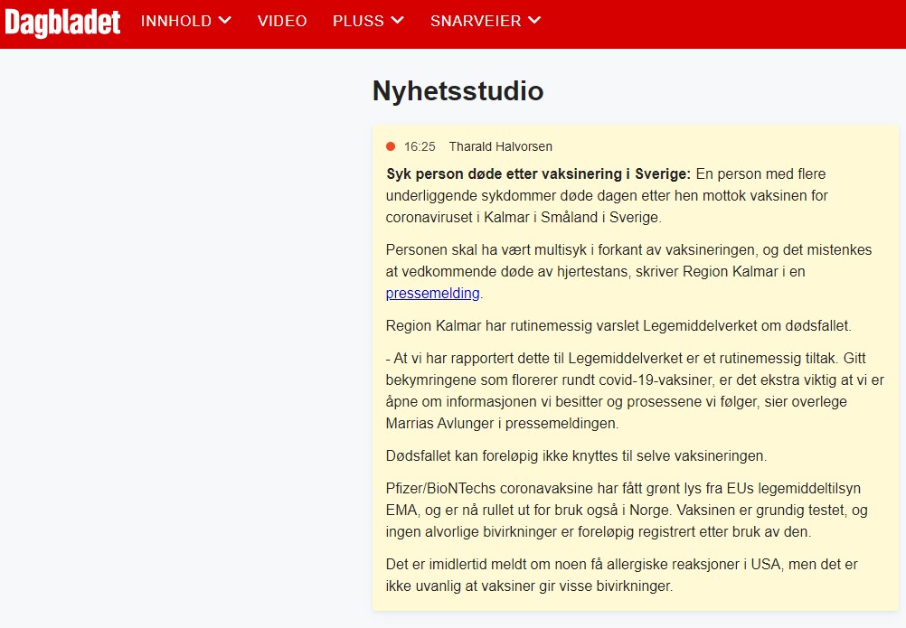 Men enda verre er det kanskje(?) at man risikerer å omkomme dersom man tar vaksinen. Det har forekommet flere dødsfall, og nå omkom en svenske av koronavaksinen til Pfizer/BioNTech. Det presiseres i media (f.eks. Dagbladet) at denne svensken hadde alvorlig underliggende sykdom, og at dødsfallet derfor ikke kan tilskrives vaksinen. Det kan selvfølgelig være sant at den omkomne hadde underliggende sykdommer som den primære dødsårsak, men det behøver slett ikke være sant heller. For denne industrien er tatt i å ljuge og fuske mer enn som godt er, noe som er veldokumentert i form av konkrete domfellelser og erfaring fra tidligere vaksinefadeser. Du kan være sikker på at Pfizer og BioNTech etter beste evne vil forsøke å feie dødsfall under teppet. Jeg har etter hvert blitt godt kjent med legemiddelgigantenes sanne natur.
