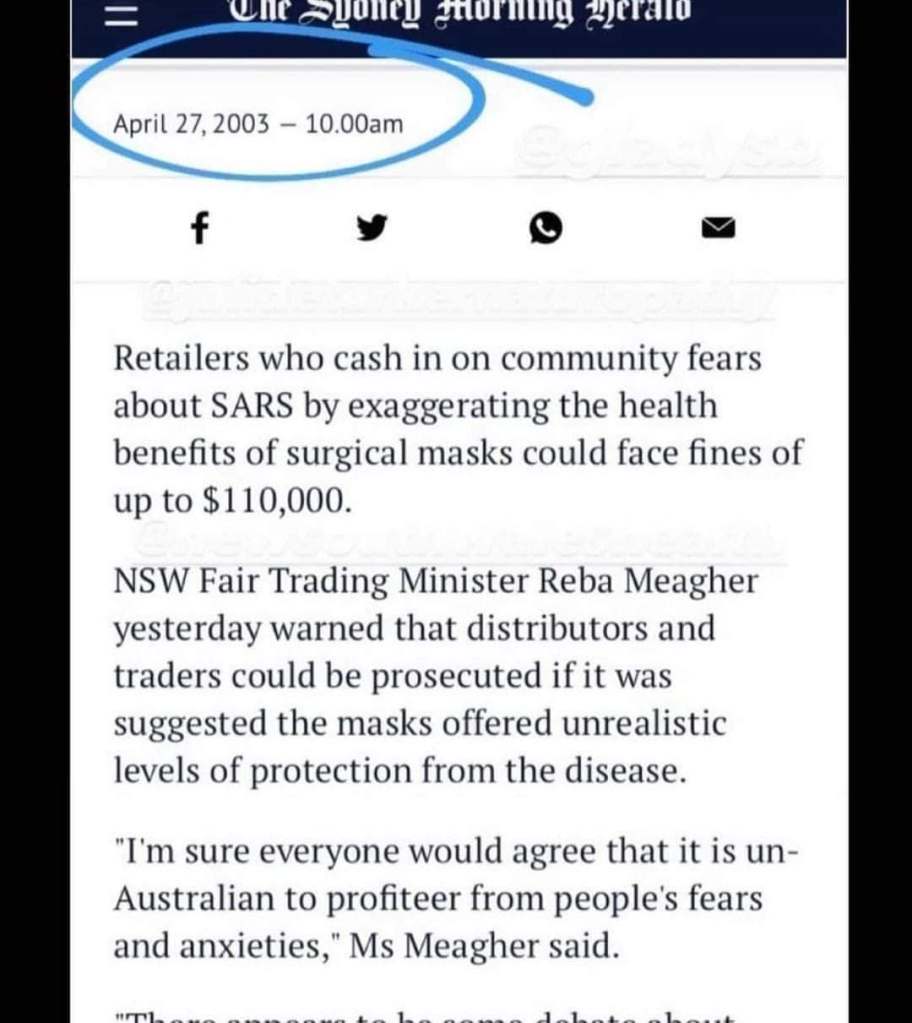 I dag, søndag 3. januar 2021, fikk jeg en PM som viste et utklipp fra den australske avisa Sydney Morning Herald. I utklippet stod det å lese at forhandlere som forsøkte å tjene penger på den allmenne frykten for SARS-viruset ved å overdrive helsegevinsten til kirurgiske munnbind, ville bli botlagt med bøter opptil 110 000 dollar. Jeg antar at det her er snakk om australske dollar, noe som tilsvarer 729 000 norske kroner etter dagens valutakurs. Hvis man regner med over 17 års inflasjon, så var beløpet trolig det dobbelte den gang da, tilsvarende cirka 1,5 millioner norske kroner.