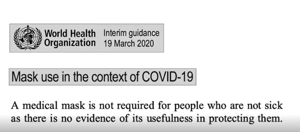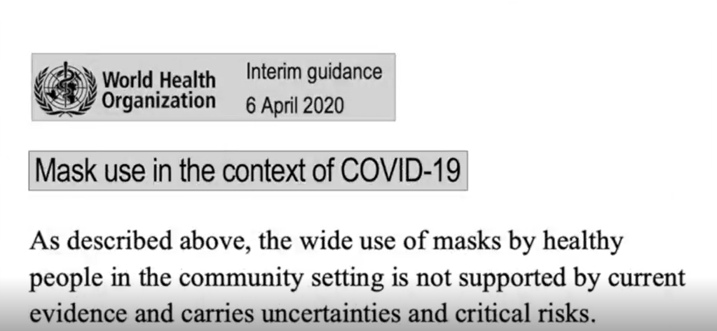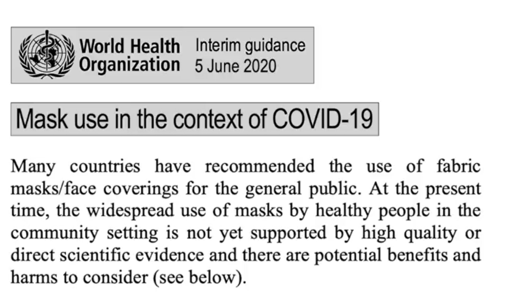 10. juli 2020: En nyhetskorrespondent kunngjør på britisk tv at WHO fortsatt ikke har funnet noen holdepunkter for at munnbleier har noen nytteverdi, MEN at WHO nå — etter sterk politisk påvirkning — allikevel anbefaler bruken av dem.