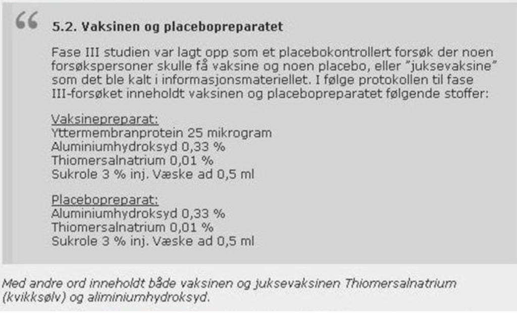 – Her skal det bemerkes at FHI gjennomførte uttestingen av denne vaksinens trygghet ved å bruke uekte placebo. Placebo, i den grad vi kan kalle det for det, inneholdt både aluminium OG kvikksølvholdige forbindelser