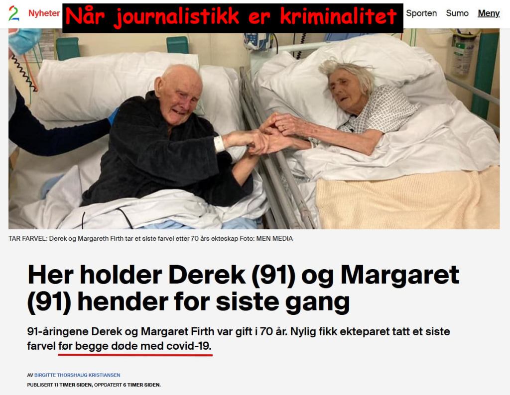 Vi er vitne til FOLKEMORD på høylys dag, hvor eldre personer nå omkommer etter å ha fått vaksinen satt. Dette er de akutte effektene av vaksinen, så gjenstår det å se hva langtidseffektene blir. Akkurat det vil nok utkrystallisere seg når vi står ovenfor neste epidemi med et noenlunde likt virus – f.eks. influensa. Jeg må si jeg opplever det som forstemmende å se 99 prosent (?) av mine norske brødre og søstre løpe rundt med denne MENINGSLØSE munnbleia over kjeften. Ja til og med når de sitter ALEINE i sin egen bil, og når de går aleine ute i det fri. Klyp meg i armen. Dette er massepsykose demonstrert i praksis!