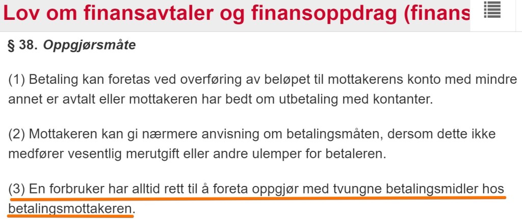 I Sentralbankloven § 3-5 (1) står det at mynt og seddel utstedt av Norges Bank er tvungent betalingsmiddel i Norge. Hva betyr det? Hvis vi leser i Finansavtaleloven § 38 (se bilde under), finner vi at en forbruker alltid har rett til å foreta oppgjør med tvungne betalingsmidler hos betalingsmottakeren. Jfr. denne paragrafens andre ledd er det mulighet for betalingsmottaker å komme med en anvisning (les: ønske) om hvordan pengetransaksjonen skal finne sted, men forbruker (betaler) er allikevel i sin fulle rett til å kreve oppgjør med kontanter.