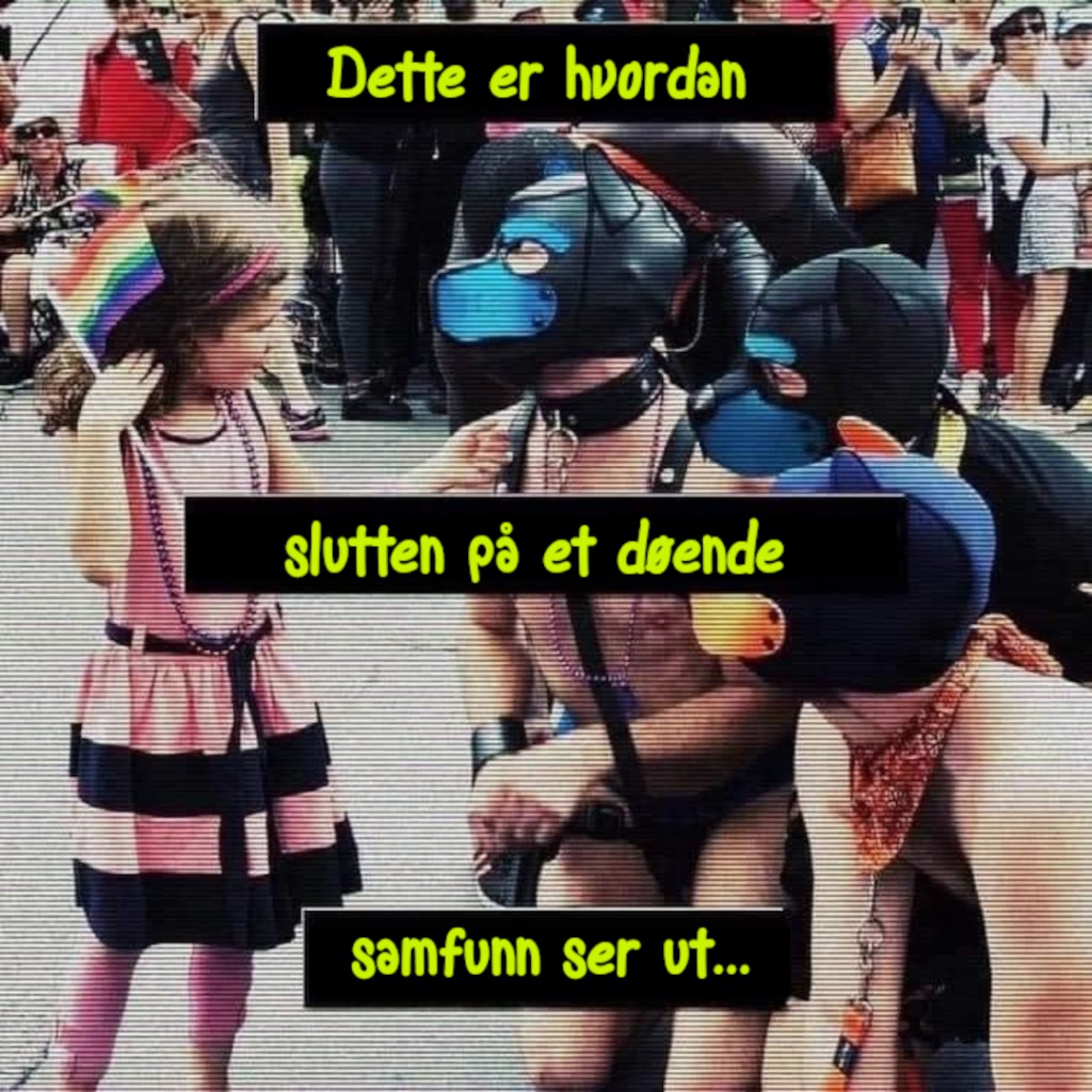 Hva gjør det med et lite barn når det må være vitne til voksne som utagerer og spiller på sex? Hva gjør det med barn som får skutt opp i ansiktet et halvnakent underliv fra en voksen Pride-parade deltaker? Hvorfor dras seksuelt innhold inn i barneskolen og barne-tv før barna har begynt å undre seg over sin egen seksualitet? I hvilken grad bidrar Pride-bevegelsen til seksualisering av barn, aksept for pedofili og senking av den seksuelle lavalderen? Hvordan innvirker det på voksne å få vite at man er kjedelig dersom man er hetero, og nærmest opplever et press om å prøve ut sex med en av samme kjønn? Blir mennesker trygge av en slik påvirkning? Eller blir man utrygg, hvor grenser for både seksuell og kjønnslig identitet viskes ut? Og det bringer tankene over på dette: Hvilken befolkning er lett å kontrollere, er det en befolkning med kritisk tankekraft og ryggrad, eller en redd og identitetsløs befolkning? Mangfold er bra, men hva gjør dette med et menneskesinn når alle grenser viskes ut? Ta bare det faktum at kjønn nå hevdes å være en sosial konstruksjon, og at det eksisterer over 50 forskjellige kjønn(!) Denne problematikken er noe folk burde få øynene opp for…