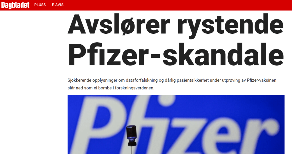 Oppsiktsvekkende nok var det Dagbladet som rapporterte om denne saken. Avisa hadde følgende overskrift: «Avslører rystende Pfizer-skandale». Saken er den at Pfizers underleverandør Ventavia har blitt fersket i grov malpraksis under fase-3 uttestingen av Covid-vaksinen. Med dette må det ikke forstås at det bare foreligger slurv, men direkte forfalskning av resultater. Dette betyr at studierapporten ikke vil fortelle sannheten om vaksinens effektivitet og trygghet. Brook Jackson, som var Ventavia-ansatt i forbindelse med forsøkene, forsøkte å varsle det amerikanske legemiddelverket FDA om Ventavias malpraksis, men opplevde å bli oppsagt fra sin stilling samme dag. Verken FDA eller Pfizer har gjort noe som helst med saken i ettertid. Tvert i mot har Pfizer har leid inn Ventavia til å utføre fire nye studier ETTER å ha mottatt varslerens rapport. Korrupsjonen i forbindelse med vaksinen mot Covid-19 synes ikke å ha noen ende.