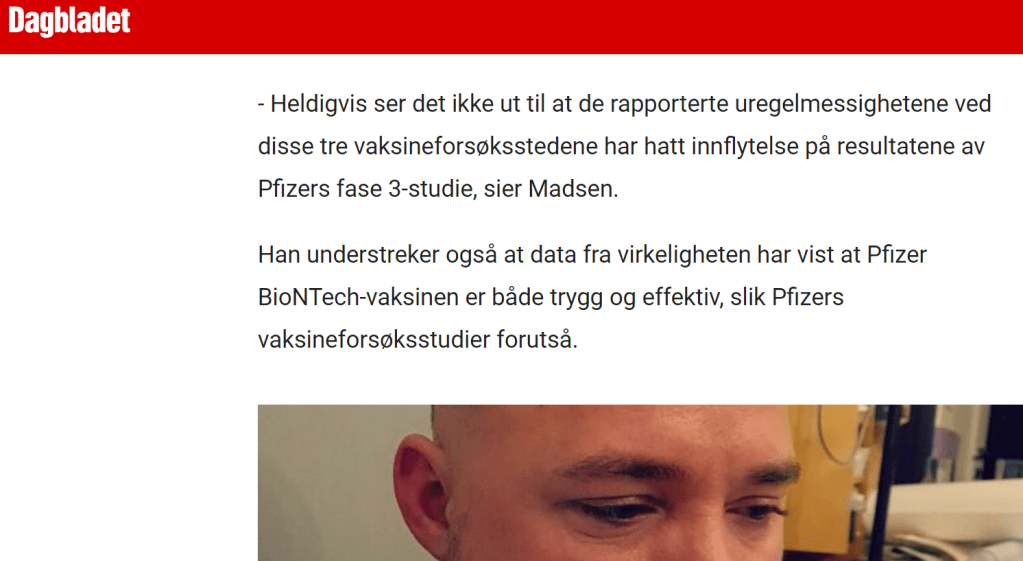 Det norske legemiddelverkets sjef, Steinar Madsen, sier imidlertid at denne avsløringen ikke er noe å ta på vei for. Dagbladet skriver: «Han [Madsen] understreker også at data fra virkeligheten har vist at Pfizer BioNTech-vaksinen er både trygg og effektiv, slik Pfizers vaksineforsøksstudier forutså.» Ha, ha, «data fra virkeligheten» altså… Ja, det er vel verdt å presisere, tatt i betraktning alt juks som farmasiselskapene har gjort seg skyldig i. Og fortsetter å gjøre seg skyldig i. Sjokkerende nok er det vel knapt noen annen forskning som er forbundet med mer svindel enn nettopp den medisinske forskningen.