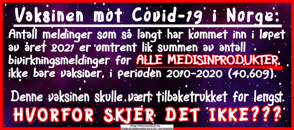 Vaksinen mot Covid-19 har allerede nådd å overskride antall innrapporterte mistenkte bivirkninger for svineinfluensavaksinen Pandemrix med en faktor på 13(!) Hvorfor trekkes ikke denne vaksinen fra markedet??? Det er ikke spesielt vanskelig å skjønne at det ligger en altomfattende korrupsjon bak det som nå skjer… Og hva med Madsen og de andre impliserte i Helse-Norge, skal de få gå fri etter å ha bidratt til å skape enda en helsekatastrofe?