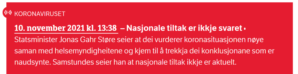 Riktignok sa Støre på onsdag at han ikke kunne utelukke nasjonale tiltak, men denne kuvendingen kom veldig kjapt. Grunnen til at de nå velger å stramme inn med nye smitteverntiltak skal være at de ønsker å bevare kapasiteten på sykehusene. Dette var jo også begrunnelsen ved koronakrisens oppstart, da det norske folk ble bedt om å holde ut smitteverntiltakene en liten stund, slik at helsevesenet ikke skulle bli overbelastet. Det skulle vise seg at vi aldri kom i nærheten av å oppleve et overbelastet helsevesen, ja det ble faktisk tidlig klart. Men de absurd kneblende tiltakene fortsatte allikevel, med nedbemannede sykehusavdelinger. Og tiltakene fortsatte. Og de fortsatte. Uten at folk turde mukke.