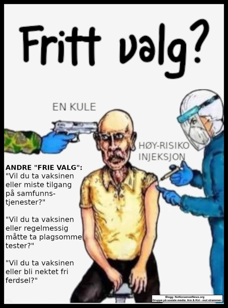 De fortsetter å true og terrorisere det norske folk, for det er faktisk direkte trusler de kommer med nå…. Trusler, løgner og propaganda for å skremme folk til å ta sprøyta og underkaste seg. De svakeste der ute vil nok gi seg og bukke under, men de sterkeste av oss vil bare bli enda mer innstilt på å kjempe i mot. Jeg kommer ALDRI til å ta verken noen test eller sprøyte. De kan true meg, forsøke å bøtelegge meg, fengsle meg om de vil: jeg vil aldri gi meg! Vi har kjærligheten, sannheten og medmenneskeligheten på vår side, psykopatene har kun frykt på sin side… frykt og løgner. Stå på dere to, styrke og rettferdighet.