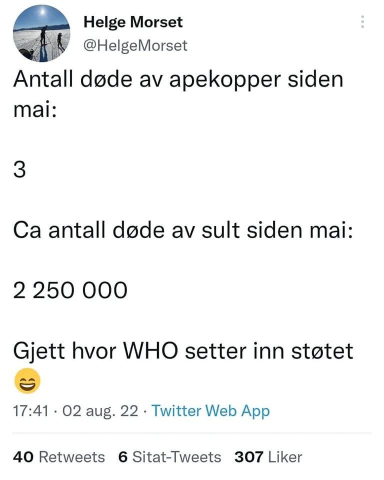 Fra samme artikkel i Nettavisen framgår det at FHI fortsatt promoterer den katastrofale vaksinen mot Covid-19: «Fremover er det viktig at personer over 75 år og sykehjemsbeboere tar en fjerde dose med koronavaksine. Disse gruppene skal få tilbud om vaksine i kommunen de bor i.» Som om ikke ekspertisen ved FHI nå har skjønt at koronavaksinen er en medisinsk katastrofe. Men, det er vel slik at jo fortere de eldste åker under torva, jo færre pensjonsutbetalinger blir det.