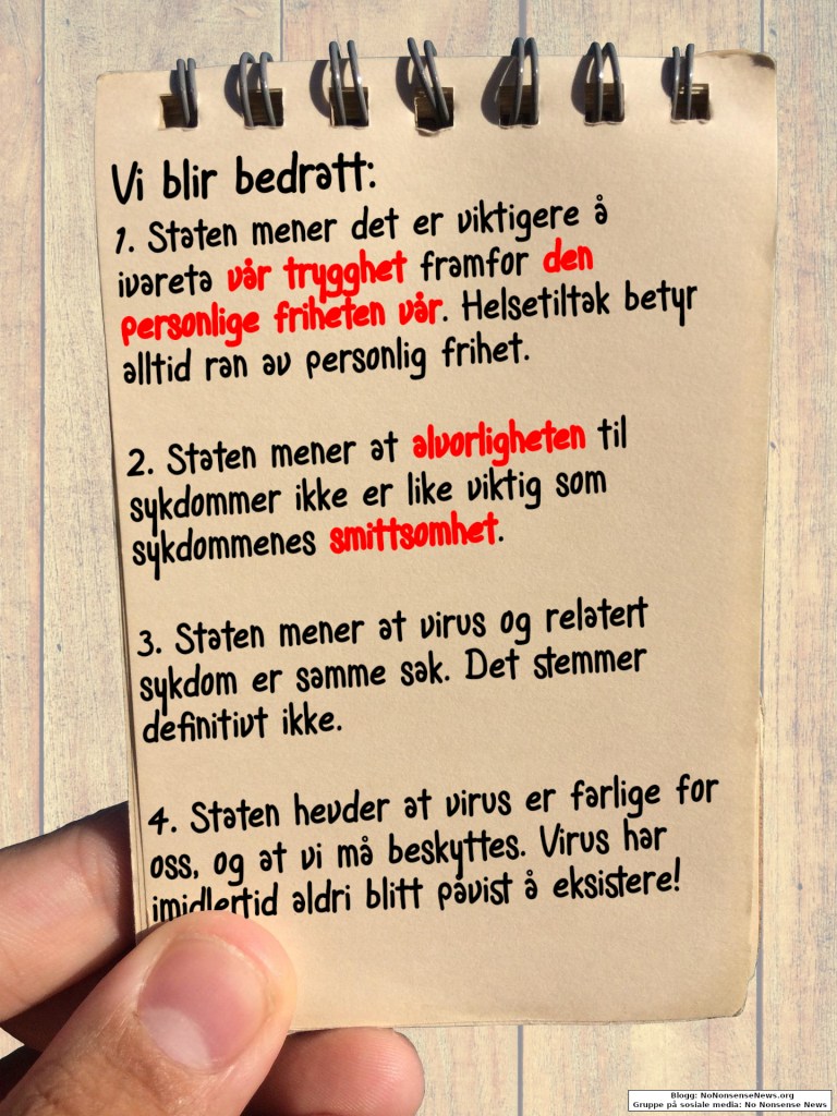En annen absurditet er det faktum at det ble satt likhetstegn mellom smitte og utviklet sykdom. Men dette er to vidt forskjellige ting! Vi har alle mengder av disse proteinene kjent som virus i kroppen, uten at vi blir syk av den grunn. Man kan altså ikke sette likhetstegn mellom smitte og sykdom, men det var nettopp hva de gjorde. På hvilken måte ble dette utnyttet under koronakrisen? Jo, sett at en person skulle slumpe til å dø av kreft, så kunne obduksjonsrapporten likevel hevde «død av Covid-19». Dette har vært gjeldende praksis så fremt avdøde hadde fått påvist koronasmitte innenfor et visst tidsrom før eller etter dødsfallet. På merkelig vis har denne absurditeten fått passere. Hallo alle medisinere der ute, hvor har dere hodet og hjertet deres??! Som følge av dette er antall koronadødsfall trolig ekstremt overdrevet. Ikke bare her til lands, men på verdensbasis. Norge var nemlig langt fra alene om å adoptere denne typen medisinsk malpraksis under koronakrisens forløp, og det gjøres trolig fortsatt.