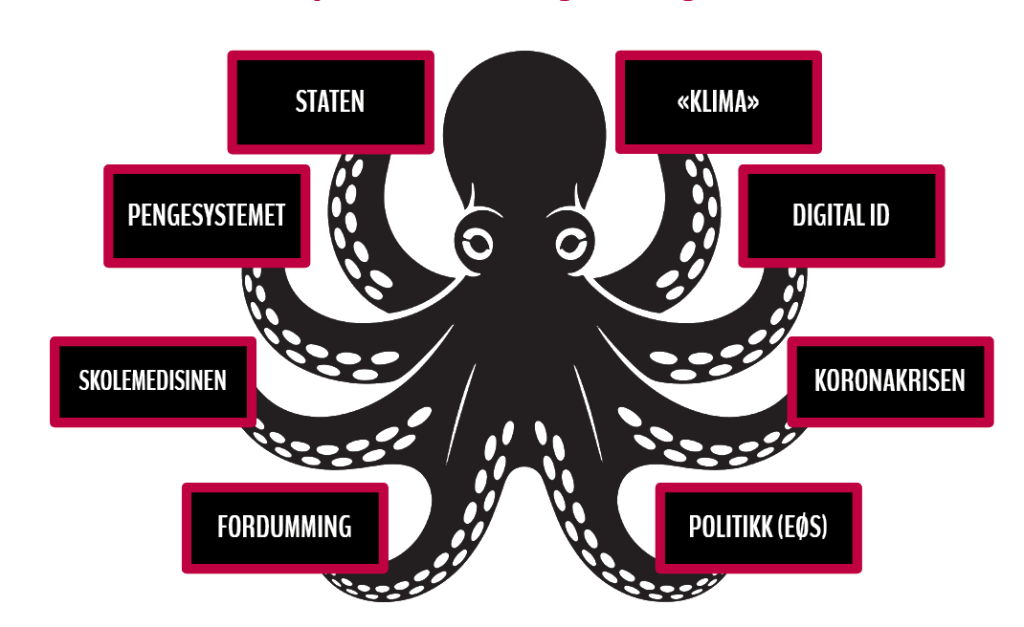 En annen blekksprutarm er EØS-avtalen. Så lenge denne avtalen får eksistere vil Norge være holdt fanget som melkeku for det parasittiske EU og Europas energibehov. Ingen får lov å nevne at EØS-avtalen i realiteten er en tvangstrøye som setter det norske handlingsrommet sjakk-matt, og at eneste løsning er å bryte avtalen for at norsk selvråderett skal gjenvinnes.