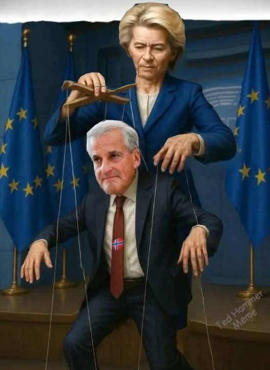Som sagt, den eneste veien ut av dette vanføret er selvfølgelig å si opp hele EØS-avtalen, men DET får du ikke Jonas Gahr Støre med på. Støre blir styrt av kartellmakten bak EU. (Hvorfor har ingen av nei-partiene på Stortinget noen gang foreslått å tre ut av den parasittiske og ødeleggende EØS-avtalen??!! Kun Kystpartiet har fremmet forslaget, men vi vet jo alle hvor lenge partiet fikk lov å være representert på Stortinget før det ble tuppet ut). Norge er en vasallstat under EU og fint lite annet! Vi bestemmer ikke på egen grunn.